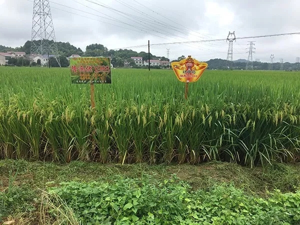上午9時許,一行50多人從酒店出發(fā)前往北盛鎮(zhèn)隆兩優(yōu)1988觀摩會現(xiàn)場,田間立著財神稻的展示噴繪,財神客戶們紛紛駐足拍照留影,有的還下到田里看穗子、數(shù)分蘗,仔細(xì)查看品種表現(xiàn)。觀摩田塊為5月18日播種,瀏陽區(qū)域大部分農(nóng)戶都是選擇一晚種植,集中在5月中下旬播種,剛好遭遇了高溫高濕的天氣,隆兩優(yōu)1988在今年特殊年份所表現(xiàn)出的超高結(jié)實(shí)率、稻瘟病抗性、分蘗能力得到在場所有人的一致好評。