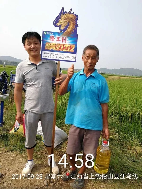 2017年9月23日,隆王稻在上饒市弋陽(yáng)縣迎來(lái)了測(cè)產(chǎn)首秀,在弋陽(yáng)縣代理商朱梅英和姜華老師以及旗山鄉(xiāng)經(jīng)銷商奚天金的組織下,共20位種植大戶見(jiàn)證了隆兩優(yōu)1212當(dāng)?shù)氐谝淮螌?shí)地收割測(cè)產(chǎn)大會(huì)。