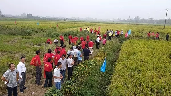 2017年9月24日上午,百分農業(yè)應鼎城石公橋經(jīng)銷商陳月清邀請前往石公橋鎮(zhèn)文家坪農戶曹志才示范田實地測產(chǎn)實收,參會人員有常德鼎城代理商鄧總、百分湖南大區(qū)劉浩經(jīng)理、鼎城區(qū)高級農藝師周老師、160位鼎城的零售商、種植大戶及沅江、石門慕名而來一睹財神稻高產(chǎn)風采的代理商、大戶朋友們。
