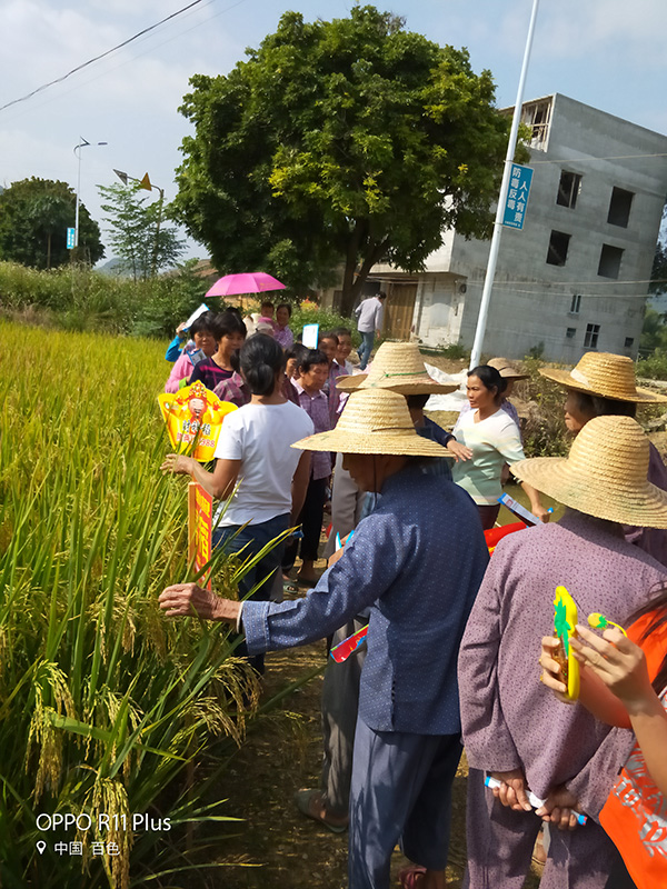 2017年10月27日下午2點(diǎn),由平果縣代理商黎梅香及零售商黃阿姨共同組織召開(kāi)隆兩優(yōu)1988的現(xiàn)場(chǎng)觀摩會(huì)。剛進(jìn)入平果縣榜圩鎮(zhèn)上力村頭,車(chē)剛停下就有不少熱情的村民過(guò)來(lái)打招呼。隨后,零售商黃阿姨走巷竄戶通知了還沒(méi)有到來(lái)的種植能手,很快人潮涌動(dòng),笑聲一片。準(zhǔn)備工作進(jìn)行中,給鄉(xiāng)親們派發(fā)了品種單頁(yè)、田間插牌、到位人數(shù)簽到等。
