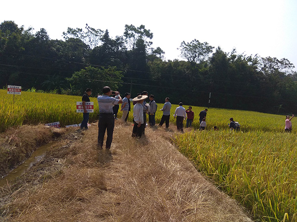 2017年10月29日,世界長壽之鄉(xiāng)——浦北縣,慶豐農(nóng)業(yè)有限公司組織召開了隆晶優(yōu)1號觀摩會。在整齊的示范田里,隆晶優(yōu)1號一片金黃,枝桿清秀,穗頭整齊,整片田塊基本沒有包括矮縮病在內(nèi)的病蟲害!包括浦北、靈山兩個縣的種子零售商也朋友們一起參觀了示范基地,認(rèn)真考察了隆晶優(yōu)1號的表現(xiàn),不斷稱贊!