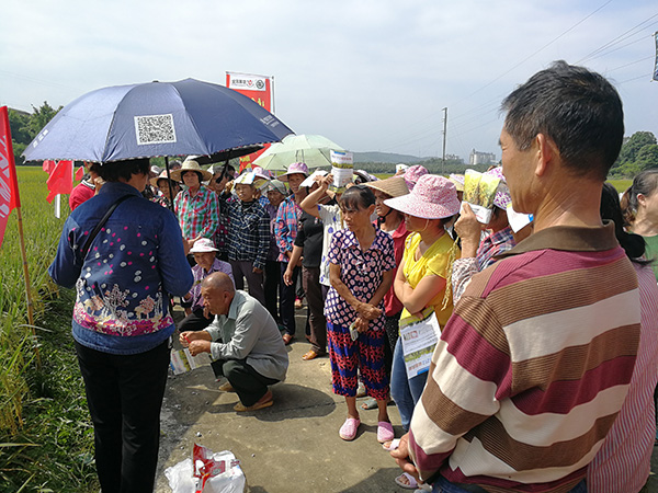 合作伙伴陳桂英對(duì)晶兩優(yōu)1212田間管理進(jìn)行講解