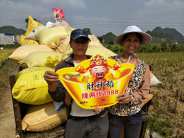 下午收割機到來,轟隆的氣笛聲中一袋袋谷子入袋,豐收的喜悅再也無法將臉上的笑容掩蓋,大家紛紛豎起大拇指,這產量就是高啊,隊長大聲地問到:“隆兩優(yōu)1988種不種?”“種!”洪亮的聲音響滿田間地頭,讓笑容齊飛,迎接豐收。