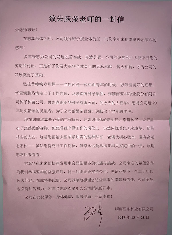 憶往昔崢嶸歲月稠——當(dāng)他還是一位熱血青年的時(shí)候,他帶著美好的理想,懷著滿腔熱情走上了工作崗位,從湖南省種子集團(tuán),到湖南亞華種業(yè)股份有限公司種子種苗公司,再到湖南亞華種子有限公司,到今天的大亞華。他是公司近20年歷史沿革的見證者,無數(shù)的亞華之種經(jīng)他的雙手送往祖國各地,為了公司的繁榮昌盛,他獻(xiàn)出了寶貴的年華。