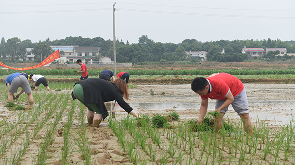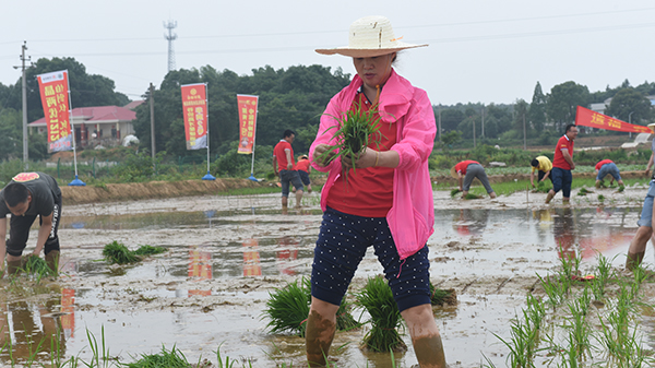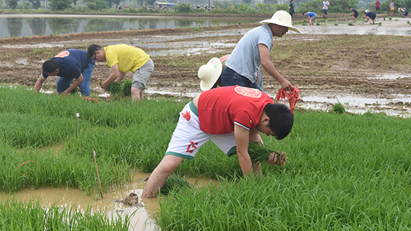 隨著種植挑戰(zhàn)賽正式拉開序幕。參加插秧活動的選手們紛紛挽起褲腳,赤腳跨進秧苗田里,彎下腰,將秧苗一束一束的從稻田里拔出來。身著紅衣的選手們揮汗如雨,奮力拼搏著,使得這寬闊安靜的農(nóng)田頓時變得熱火朝天起來。