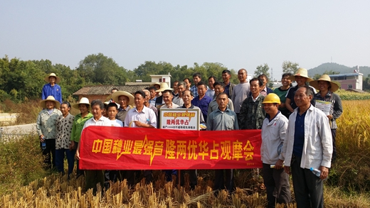 10月19日,五十多位農(nóng)戶齊聚江西信豐縣西牛村看隆兩優(yōu)華占的二晚表現(xiàn)。