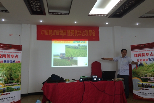 安徽分公司總經(jīng)理武俊海給零售商做品種介紹,通過例舉在不同的氣候條件、不同的栽培模式下品種的表現(xiàn)情況,總結(jié)了隆兩優(yōu)華占的八大亮點:1、株葉形態(tài)好;2、分蘗力強;3、耐肥、抗倒;4、高抗稻瘟??;5、耐高溫抗低溫;6、適合各種栽培模式;7、秧齡彈性大;8、主穗、分蘗穗整齊大小一致。