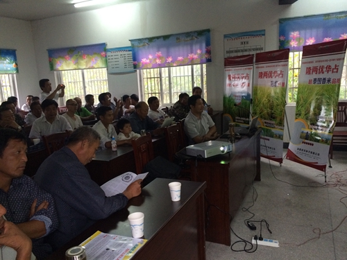 回到會(huì)議室,亞華種子有限公司張來友先生,就公司的情況,科研實(shí)力、隆兩優(yōu)華占的親本來源、特征特性、今年在全國(guó)各個(gè)省,特別是安徽省各個(gè)縣市的表現(xiàn)等情況,向各位大戶和零售商一一做了介紹。