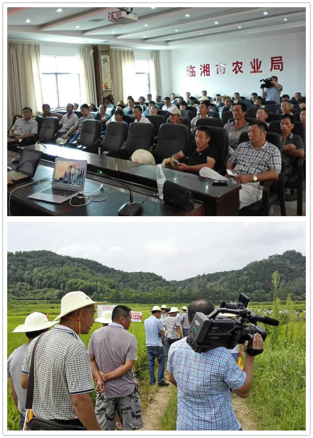 2015年8月11日,在全國著名的“竹木之鄉(xiāng)”、“茶葉之鄉(xiāng)”、“有色金屬之鄉(xiāng)”的臨湘市隆重召開了隆兩優(yōu)華占再生稻觀摩會。上午9點左右,臨湘市隆兩優(yōu)華占零售商、臨湘市農(nóng)業(yè)局相關人員、部分種植大戶將近70人在臨湘市農(nóng)業(yè)局集結(jié)完畢,分別坐上三輛中巴車浩浩湯湯的開往了會議觀摩地點臨湘市五里牌鄉(xiāng),各參會代表到達隆兩優(yōu)華占示范種植田后,大家都迫不及待的俯身在田間數(shù)穗粒數(shù)、看分蘗及結(jié)實率情況。