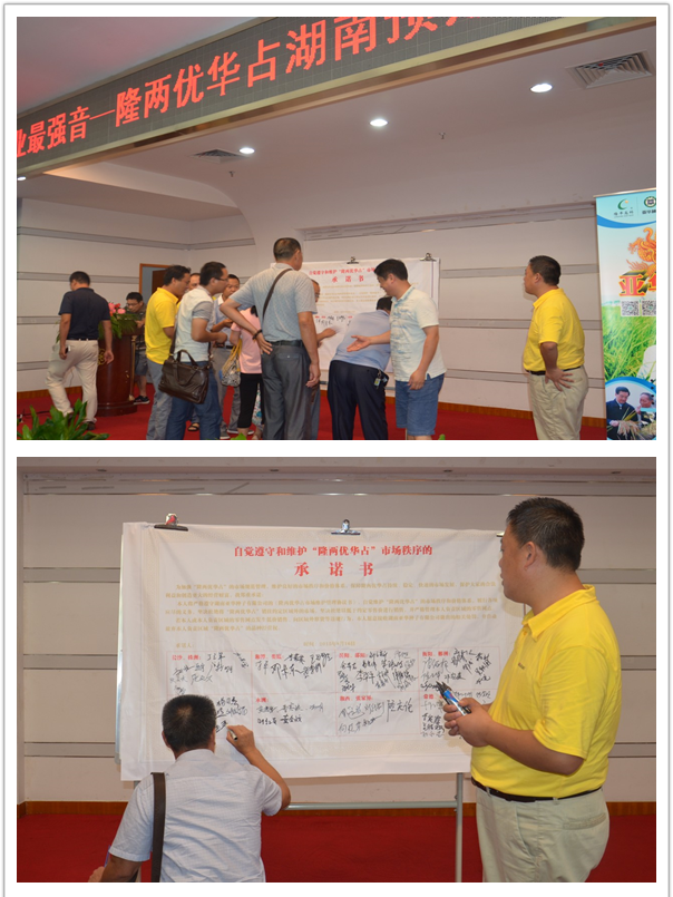 寧鄉(xiāng)歐總、汨羅喻總、祁陽(yáng)曹總、洞口劉總、漢壽周總等經(jīng)銷商代表也紛紛上臺(tái)作出講話,首先他們都高度贊揚(yáng)了隆兩優(yōu)華占表現(xiàn)出的高產(chǎn)、抗病、抗倒、再生力強(qiáng)、米質(zhì)優(yōu)等優(yōu)秀品質(zhì),并且一致認(rèn)同亞華種業(yè)這次在預(yù)定方式上做的改革。在市場(chǎng)規(guī)范方面,經(jīng)銷商們都積極、主動(dòng)、自發(fā)地簽署了“隆兩優(yōu)華占市場(chǎng)秩序維護(hù)承諾書”,并且表示從大局來(lái)看,這是人人都必須遵守的規(guī)則,是實(shí)現(xiàn)共贏的堅(jiān)實(shí)基礎(chǔ)。