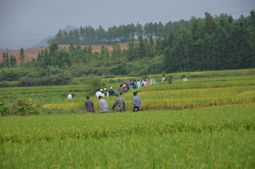 上午9點10分,天公作美雨停了。“出發(fā)!”,洪老板大吼一聲,40余人伴隨著摩托車的轟鳴聲,浩浩蕩蕩出發(fā)去看禾咯。此次觀摩地點有三處,依次為二晚田塊,一晚田塊,一季中稻田塊。下面就讓我們來看看隆兩優(yōu)華占究竟有何魅力,竟能讓農(nóng)民朋友們冒雨前來也要觀摩。