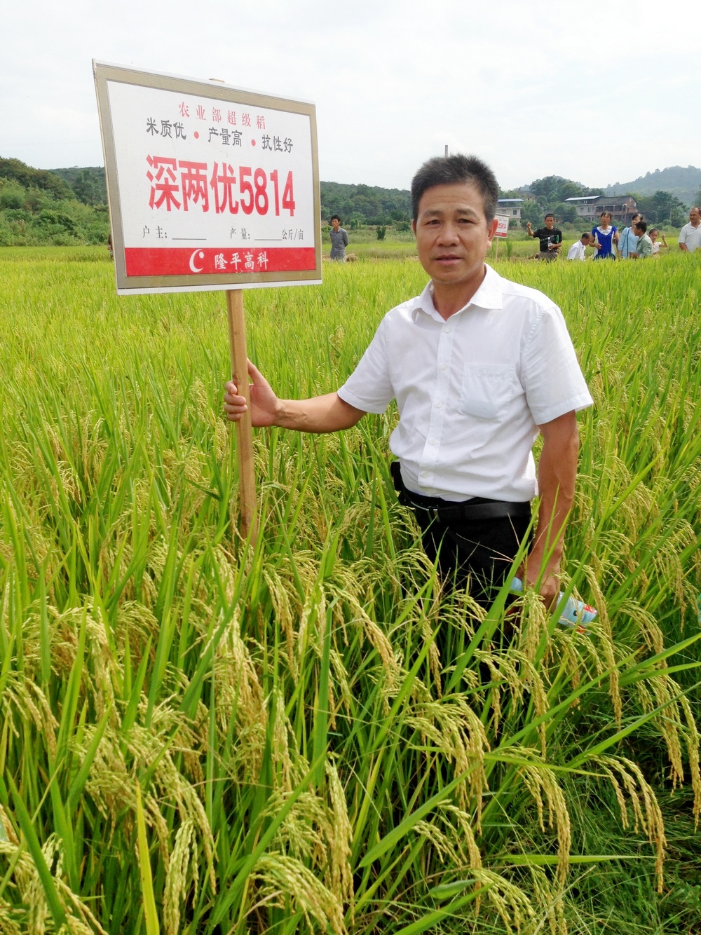 2015年9月4日,祁陽代理商曹寒鐵先生組織祁陽縣100多位鄉(xiāng)鎮(zhèn)種子經(jīng)銷商及種植大戶來到祁陽縣觀音灘鎮(zhèn)聯(lián)興村,現(xiàn)場觀摩該村種植大戶莫學(xué)森連片直播100多畝的農(nóng)業(yè)部超級稻-深兩優(yōu)5814大田,100多號人深入現(xiàn)場,看著金黃的稻穗,大家都說“真正見識到高手種植好品種的現(xiàn)場”,個個夸贊好。種植戶莫學(xué)森介紹說“2014年我也直播了60畝深兩優(yōu)5814,品種表現(xiàn)好,賺了錢,今年擴(kuò)大面積繼續(xù)直播深兩優(yōu)5814,現(xiàn)在田間表現(xiàn)基本穩(wěn)定了,肯定能賺錢”!觀摩的大戶仔細(xì)查看品種表現(xiàn),對照自己的種植的情況,詳細(xì)向種植戶打聽技術(shù),盤算著明年的播種計劃。