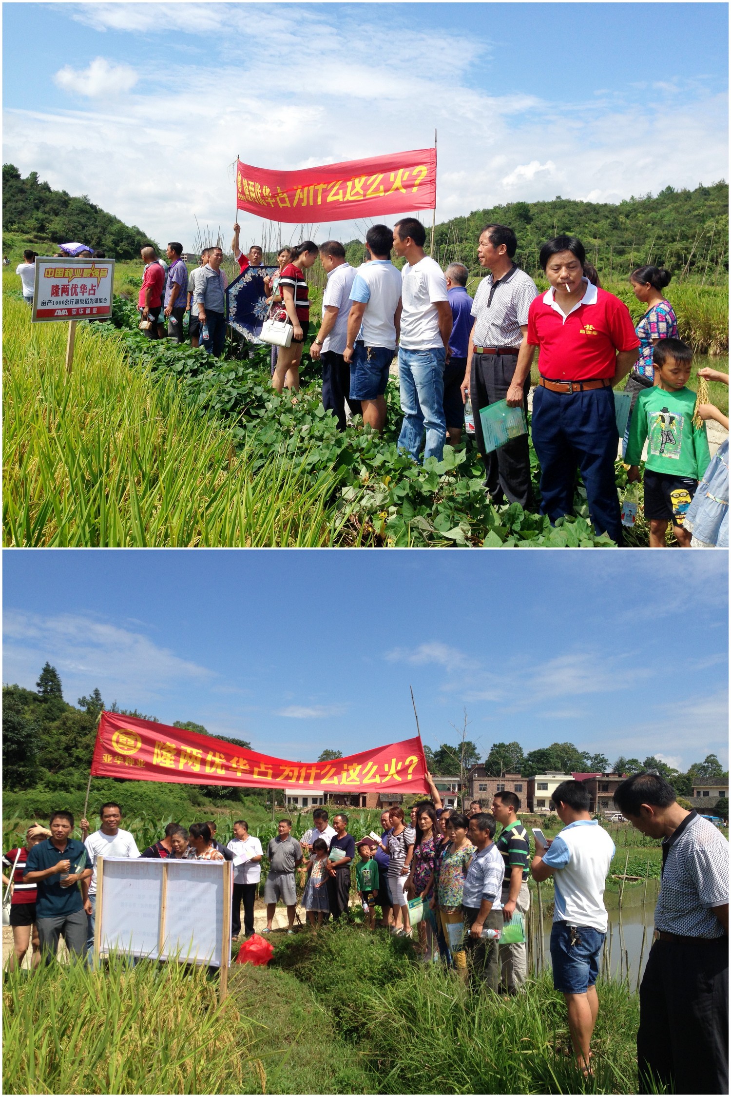 次日,為滿足大家到現(xiàn)場觀摩的要求,曹總組織近70人的觀摩團直接來到祁陽縣茅竹鎮(zhèn)灘平村,現(xiàn)場觀摩大戶柏斌連片撒播的100多畝隆兩優(yōu)華占大田表現(xiàn)。大家看到大田里密密厚厚的稻穗,都十分滿意!曹總向大家介紹當時測產的情況,具體情況是測產由種植戶、觀摩戶、記者、亞華種業(yè)代表等現(xiàn)場隨機抽取隆兩優(yōu)華占大田中間一個平方米面積,現(xiàn)場收割現(xiàn)場脫粒,由當地農戶過秤,得到每平方米濕谷3.2斤,按照85折計算畝產干谷1814斤,經計算有高達90%的結實率。通過觀摩和測產證明隆兩優(yōu)華占的超高產潛力巨大,種植戶通過合理的肥水管理,機插、直播等簡便化栽培模式一樣能獲高產,加上品種的抗病性強,穩(wěn)產性好的特點,大戶選擇隆兩優(yōu)華占是一種潮流!