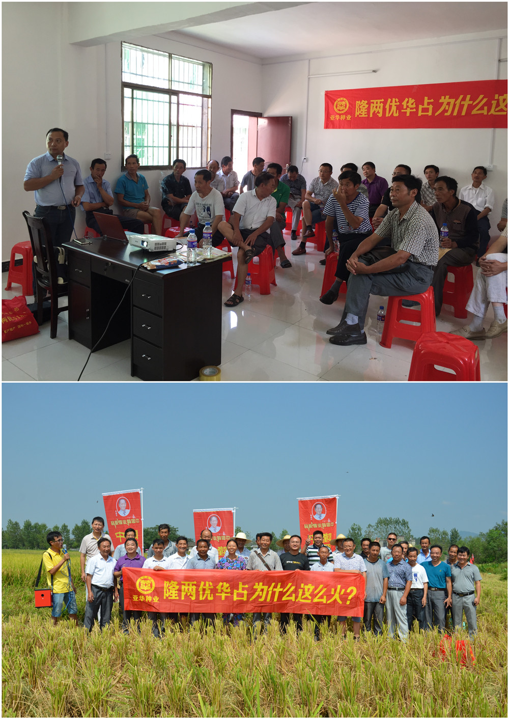 觀摩結(jié)束之后開始了室內(nèi)會議。會議上,江西分公司總經(jīng)理谷恩華就隆兩優(yōu)華占近兩年在江西各地搶眼表現(xiàn)以及年度運作思路和預(yù)定政策進行了講解,渣津鎮(zhèn)和石坳鎮(zhèn)農(nóng)技站站長講話總結(jié)了隆兩優(yōu)華占的特性:分蘗力強、抗倒性好、抗病能力強、米質(zhì)好、著粒密度密、結(jié)實率高等。兩位站長講的激情澎湃,農(nóng)戶們聽的也是有滋有味。作為在農(nóng)技站工作了多年的元老,盧站長對水稻品種的鑒定有著豐富的經(jīng)驗,會議中他激動地說到:“一個品種想要產(chǎn)量好、抗病性好、抗倒性好、米質(zhì)也好是非常難的,但恰恰隆兩優(yōu)華占就是這樣的好品種,這樣的好品種我們一定要強烈推薦給老百姓種!”