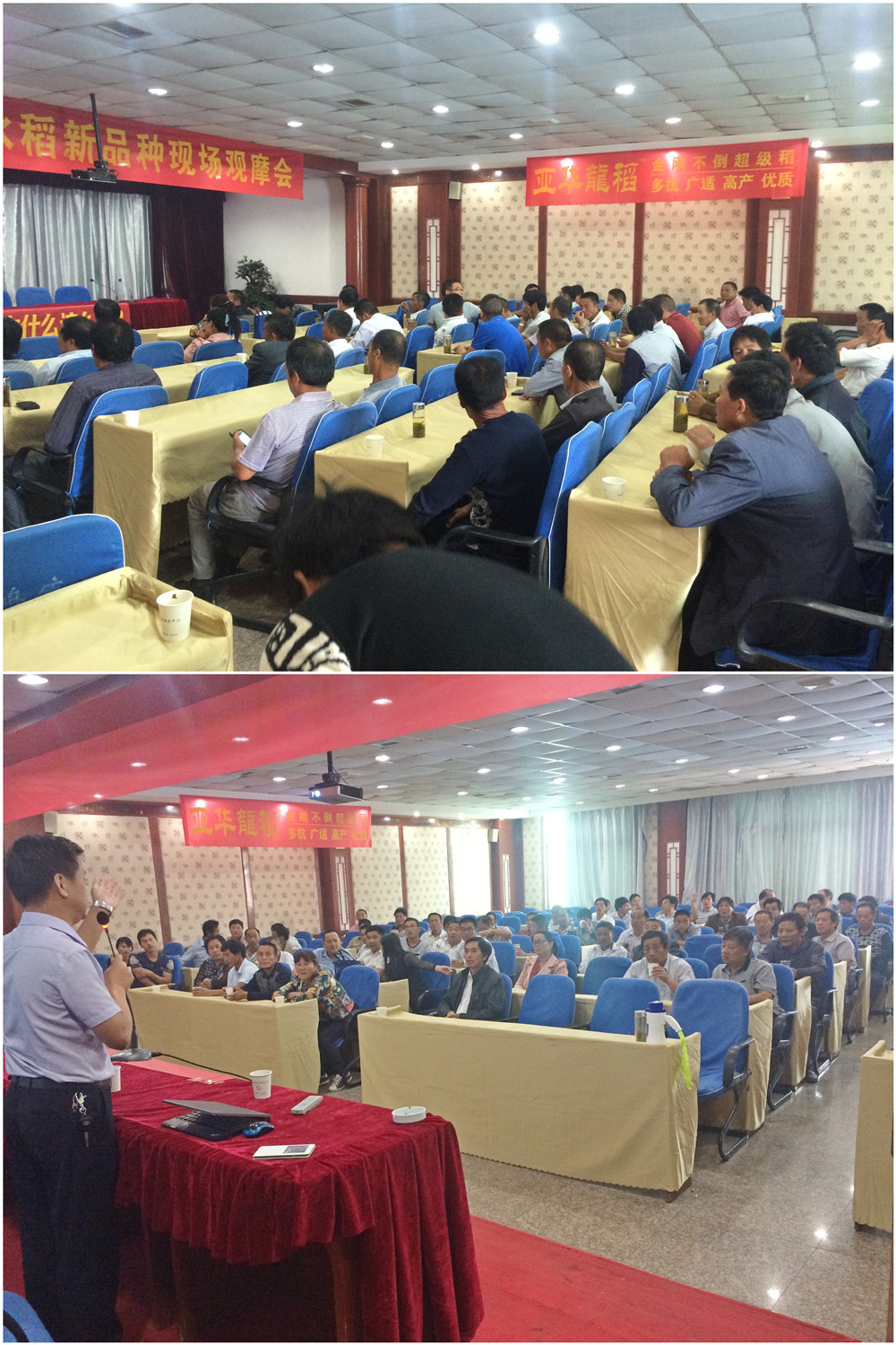 大家回到會議室,首先亞華種業(yè)區(qū)域經(jīng)理吳陵海向參會的各位零售商和種田大戶,介紹了隆兩優(yōu)華占的特征、特性,分享了隆兩優(yōu)華占在全國各省各縣、山區(qū)、丘陵、平原的表現(xiàn)情況,采用機插秧、移栽、直播等方式種植的隆兩優(yōu)華占的表現(xiàn)情況,大戶們的情緒很高,紛紛表示:明年就種它-----隆兩優(yōu)華占!