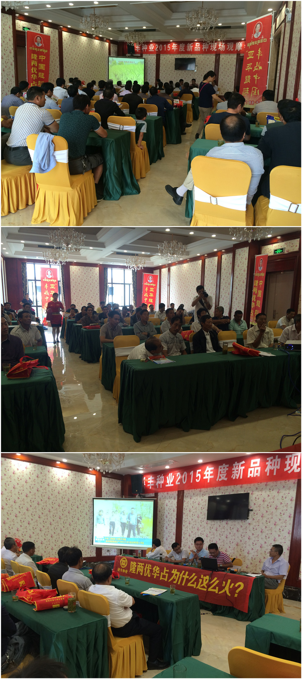 回到會議室,先由亞華種業(yè)安徽公司總經(jīng)理武俊海,向經(jīng)銷商和大戶們重點介紹了隆兩優(yōu)華占的特征特性,隆兩優(yōu)華占將是通過全國四大稻區(qū)審定的第一個品種,這意味著什么?意味著這是一個劃時代的廣適性的品種。之后武總還與大家一起分享了隆兩優(yōu)華占在全國各地的表現(xiàn)情況,特別介紹了安徽省各地的表現(xiàn)情況及產(chǎn)量情況,言畢,大戶紛紛表示明年一定要多種隆兩優(yōu)華占!增產(chǎn)創(chuàng)收!