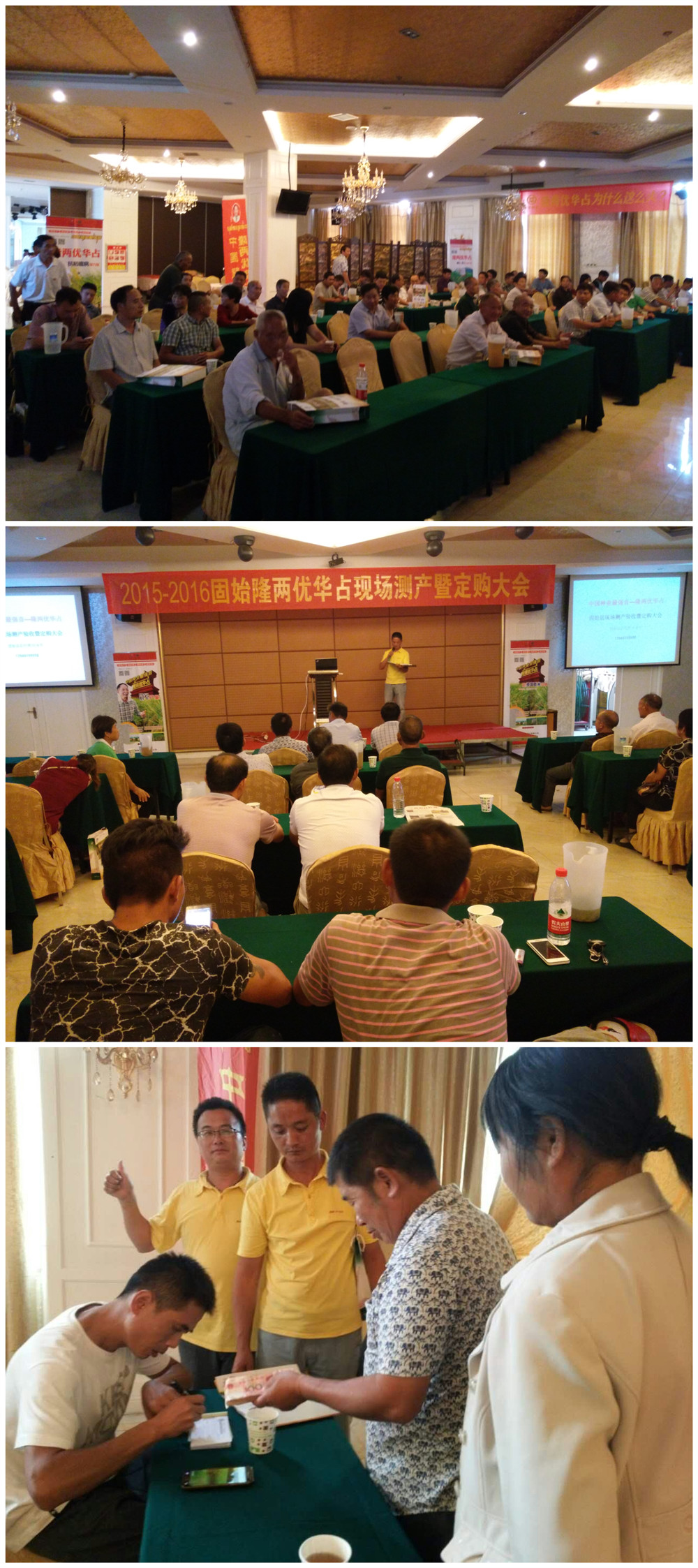 亞華種業(yè)劉松經(jīng)理在國(guó)賓大酒店的會(huì)場(chǎng)強(qiáng)調(diào)隆兩優(yōu)華占堅(jiān)決貫徹預(yù)定銷售模式,不預(yù)定、不銷售,公司全力將隆兩優(yōu)華占打造成為大、強(qiáng)、靚的精品大組合!固始縣隆兩優(yōu)華占代理商——石永軍對(duì)各鄉(xiāng)鎮(zhèn)高產(chǎn)競(jìng)賽的實(shí)際測(cè)產(chǎn)情況及預(yù)定銷售獎(jiǎng)勵(lì)政策進(jìn)行了公布:草廟鄉(xiāng)呂崗村新圩組——范讀學(xué),畝產(chǎn)1796斤;徐集鄉(xiāng)文塔村東廠組——程家平,畝產(chǎn)1737斤;蔣集鎮(zhèn)余橋村王莊組——曾健,畝產(chǎn)1530斤;觀堂鄉(xiāng)陳集村徐崗組——熊志全,畝產(chǎn)1653斤……