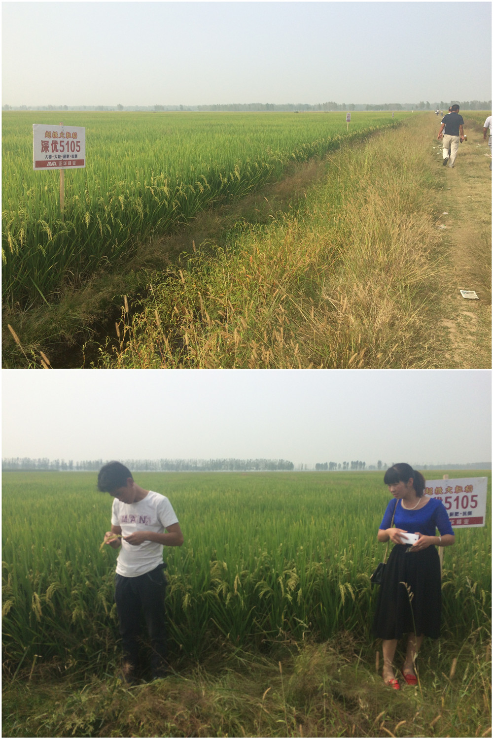 示范田是代理商自己的,面積有40多畝,全部是撒播。參會的零售商仔細(xì)地查看了品種的長勢、病蟲害等情況。大家都被品種清秀的長相、飽滿的谷粒、旺盛的分蘗力深深的折服。來自汪集的零售商付中立說他今年也弄了幾畝深優(yōu)5105的直播稻,表現(xiàn)比這個漂亮多了,明年他要把自己家的30畝田全部種上這個品種。