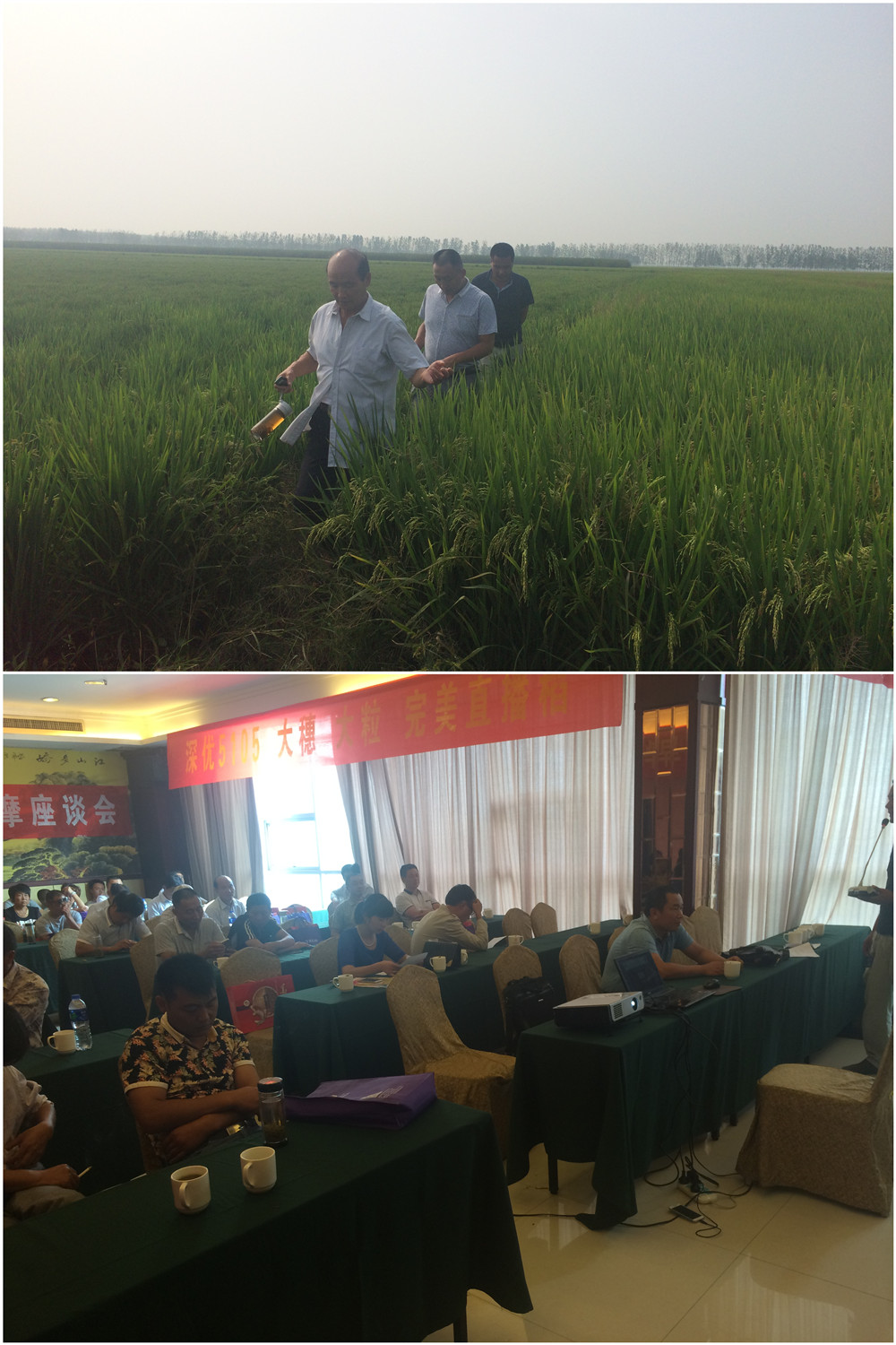室內(nèi)會議代理商向大家介紹了他種植深優(yōu)5105的一些情況:“今年在苗期遇上大水,示范田被淹了半個月,肥料都被水帶走了。后期因為忙于生意沒有顧得上管理,一直處于干旱狀態(tài),品種的大穗性狀沒有凸顯出來。因為去年推廣面積小,長得好的幾個田塊路途比較遠(yuǎn),才選了這里作為現(xiàn)場”。通過示范,他認(rèn)為深優(yōu)5105是一個大穗大粒、分蘗力強(qiáng)、耐肥抗倒的優(yōu)良直播稻品種。如果采用旱播水管的種植模式更能突顯品種的優(yōu)良特性,他相信深優(yōu)5105將成為當(dāng)?shù)刂辈サ局械耐跖破贩N!