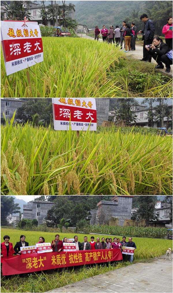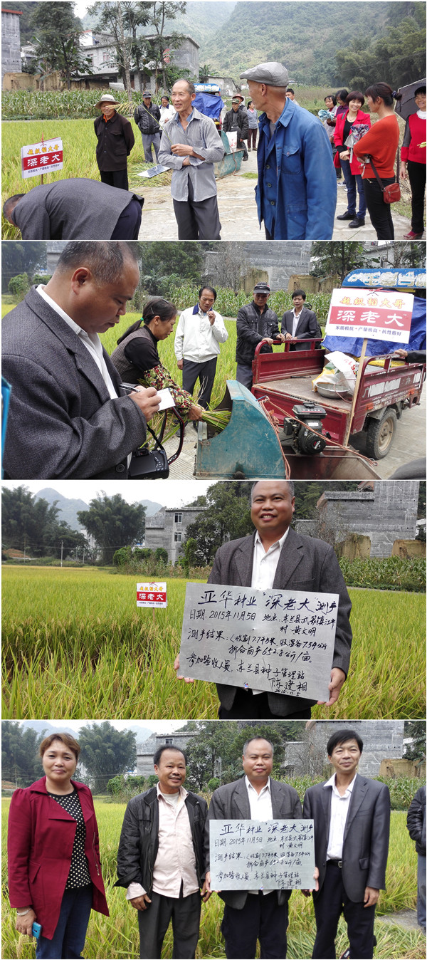 引進(jìn)新的水稻好品種,讓老區(qū)人民種出穩(wěn)產(chǎn)、高產(chǎn)田,在主糧上實(shí)現(xiàn)豐收,助推加快脫貧致富的步伐,一直是東蘭縣種子管理部門(mén)以及縣、鄉(xiāng)兩級(jí)經(jīng)銷(xiāo)商的共同心愿。作為東蘭縣農(nóng)業(yè)局原種子管理站站長(zhǎng),也是東蘭縣高級(jí)農(nóng)藝師的韋聯(lián)康,把篩選適宜當(dāng)?shù)氐暮闷贩N作為自己最大的職責(zé)。通過(guò)2年的觀察后,韋站長(zhǎng)將亞華種業(yè)的“深老大”品種鄭重地推薦給了經(jīng)銷(xiāo)商陳麗云。2015年,本著謹(jǐn)慎的態(tài)度,陳麗云引進(jìn)了少量的“深老大”種子在全縣多個(gè)鄉(xiāng)鎮(zhèn)試種,全面考察該品種的表現(xiàn)。切學(xué)、隘洞、長(zhǎng)江等中稻區(qū)的表現(xiàn)非常優(yōu)異,抗病又抗倒,8月份已喜獲豐收。縣種子管理站在切學(xué)、隘洞兩鄉(xiāng)鎮(zhèn)組織的品種對(duì)比驗(yàn)產(chǎn)中,“深老大”畝產(chǎn)高達(dá)700多公斤,在多個(gè)品種中高居第一!
