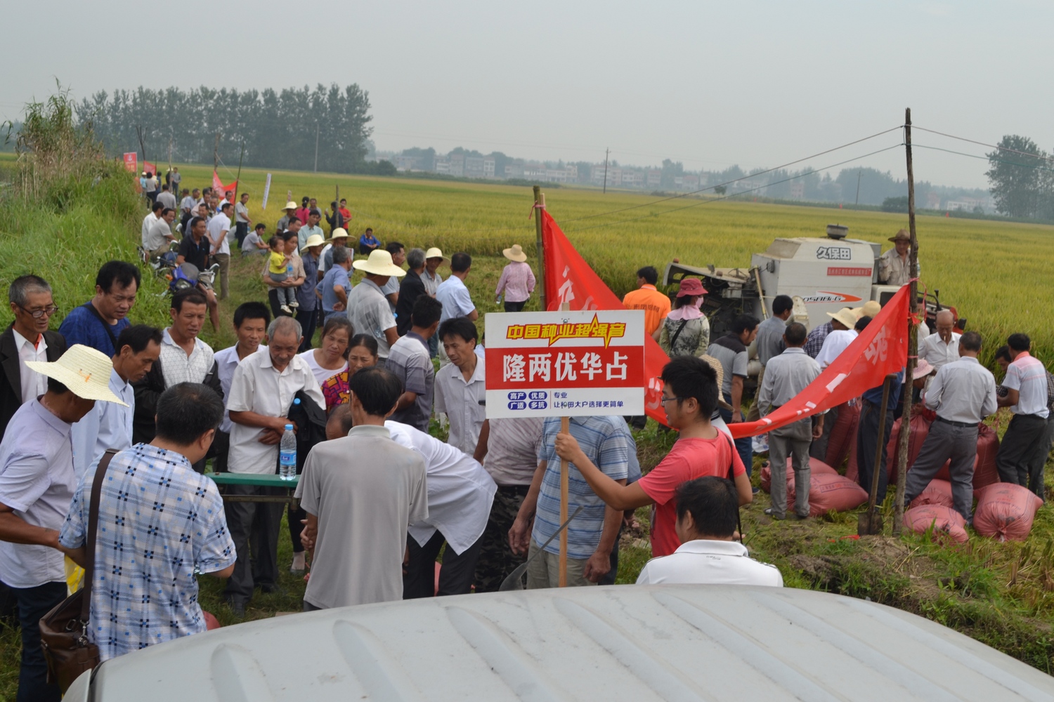 2016年9月8日上午,劉潭村二組侯明發(fā)的田邊響起一陣鞭炮聲,來自監(jiān)利縣龔場鎮(zhèn)各村莊的百余名農(nóng)戶將在這里一起見證隆兩優(yōu)華占的豐收時刻。