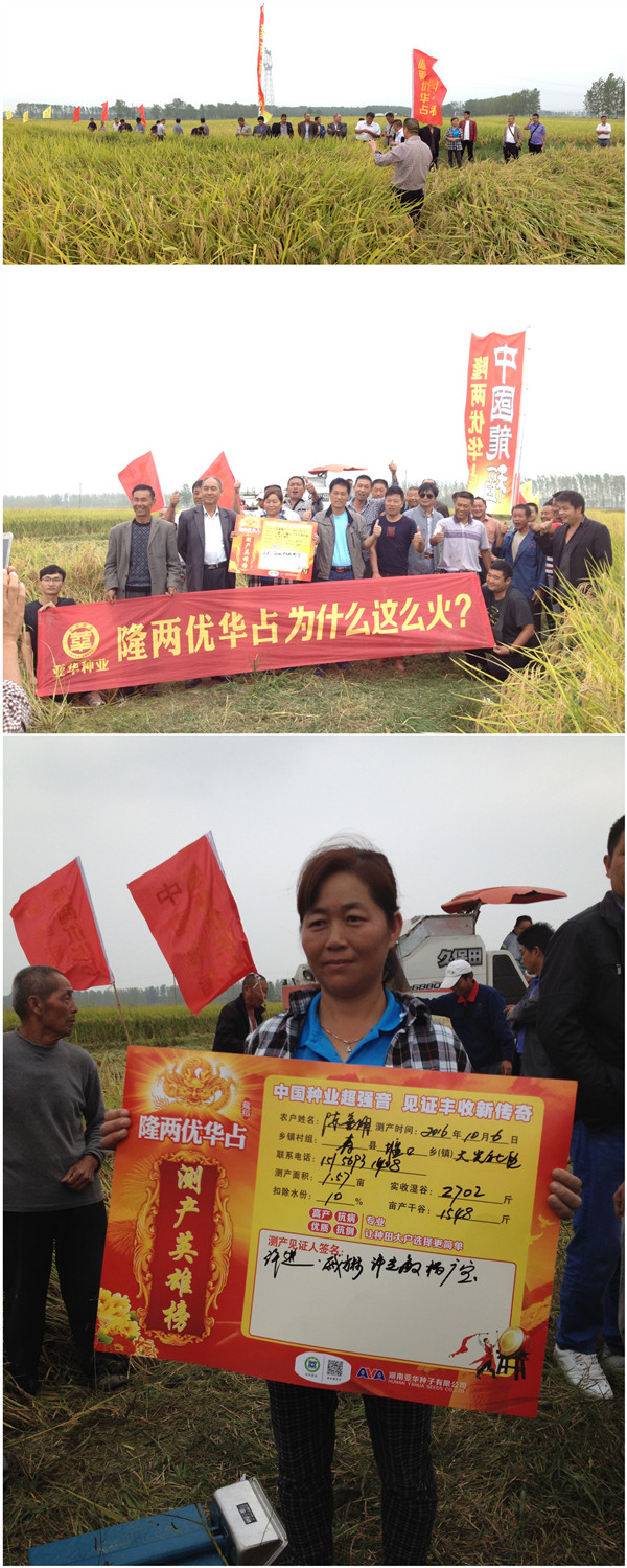 2016年10月6日,正值全國人民歡度國慶、共祝祖國67華誕之際,安徽日禾種業(yè)在安徽壽縣組織了西部部分鄉(xiāng)鎮(zhèn)零售商和種田大戶在該縣堰口鎮(zhèn)成功召開了中國龍稻———“隆兩優(yōu)華占”第三場(chǎng)田間觀摩和實(shí)際測(cè)產(chǎn)會(huì)議。測(cè)產(chǎn)田塊每畝手插秧不足8000穴,但由于隆兩優(yōu)華占分蘗率強(qiáng)、成穗率高,現(xiàn)場(chǎng)實(shí)際測(cè)得畝產(chǎn)干谷1548斤,參會(huì)人員都說這品種神了!有勁!