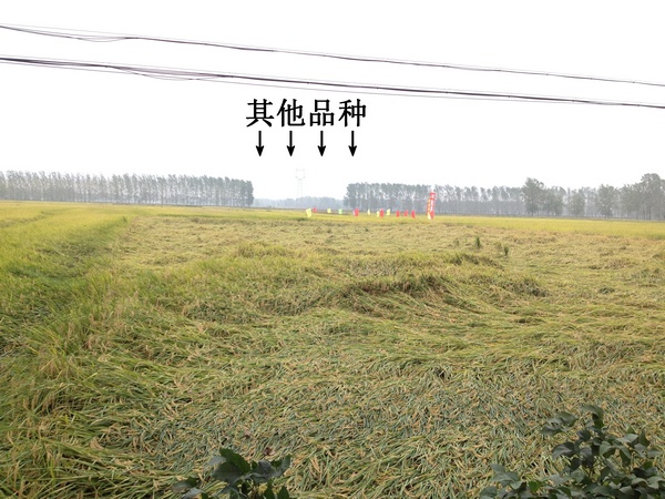 上午10時(shí)許,一行40余人來到了位于壽縣堰口鎮(zhèn)大光社區(qū)水稻種植大戶陳善明的隆兩優(yōu)華占田塊里。車子停在路邊剛下車就看見了隆兩優(yōu)華占測(cè)產(chǎn)田塊里的水稻就像與之相輝映的彩旗一樣,迎風(fēng)飄揚(yáng)、英姿颯爽。而與之形成鮮明對(duì)比的是相鄰的上年度某暢銷品種田塊,出現(xiàn)大面積倒伏,足以襯托出隆兩優(yōu)華占在抗倒方面的較強(qiáng)優(yōu)勢(shì)。