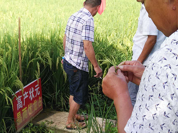 首先由亞華種業(yè)胡軒經(jīng)理及相關(guān)工作人員帶領(lǐng)農(nóng)戶去晶兩優(yōu)龍占示范田觀摩,讓農(nóng)戶對品種有直觀而確切的了解。今年晶兩優(yōu)龍占在孕穗和抽穗期全程經(jīng)歷高溫,但依然抽穗齊,結(jié)實(shí)率高,有農(nóng)戶隨機(jī)數(shù)了稻穗的實(shí)粒數(shù)有280粒,實(shí)地驗(yàn)證了品種的高產(chǎn)特性。隆兩優(yōu)龍占分蘗強(qiáng)、抗性好、耐高溫等特性大家有目共堵,優(yōu)異的田間表現(xiàn)得到了農(nóng)戶們的一致好評。