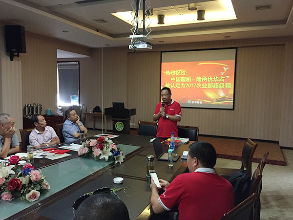 在室內(nèi)會(huì)議中,首先由亞華種業(yè)湖北分公司李小軍經(jīng)理對(duì)隆兩優(yōu)華占的一系列傳奇故事進(jìn)行了回顧,并對(duì)隆兩優(yōu)華占在2017年獲得的“水稻明星育種品種”、“2017年農(nóng)業(yè)部超級(jí)稻”、“榮登四國(guó)審寶座”等榮譽(yù)進(jìn)行介紹。