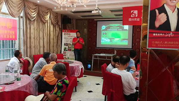 測產(chǎn)會后,在洪山鎮(zhèn)零售商胡老板的主持下召開室內(nèi)會議,會議首先由百分農(nóng)業(yè)湖南財神線經(jīng)理陳鋒就百分農(nóng)業(yè)概況、財神稻在全國各區(qū)域的表現(xiàn)、高產(chǎn)賽等情況給在場的觀摩人員進行了介紹與講解。之后與會的零售商和種植大戶就財神稻的種植要點以及田間管理要求進行了交流。會場十分火爆,有種植大戶之前對品種選擇十分猶豫,70多畝田選了好幾個品種種植進行對比,財神稻高抗病、耐高溫、高抗倒的表現(xiàn)在田間表現(xiàn)得淋漓盡致,所以種植大戶說明年只種財神稻。