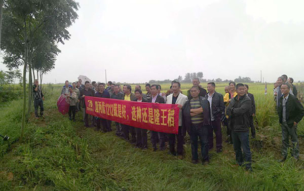 上午10點整,雖然下起了大雨,但在種植戶們強烈要求下,一行70人冒雨前往田間觀摩!種植大戶們紛紛稱贊隆兩優(yōu)1212株葉形態(tài)好、葉青籽黃、結(jié)實率高!并一同高舉“隆兩優(yōu)1212就是好,選種還是隆王稻”橫幅合影。
