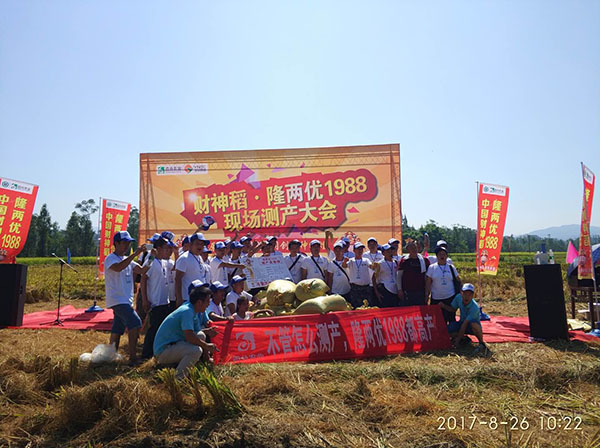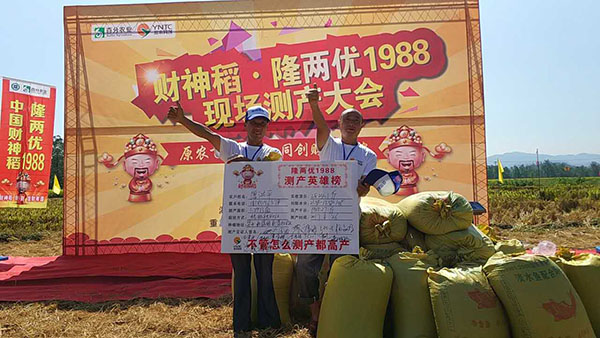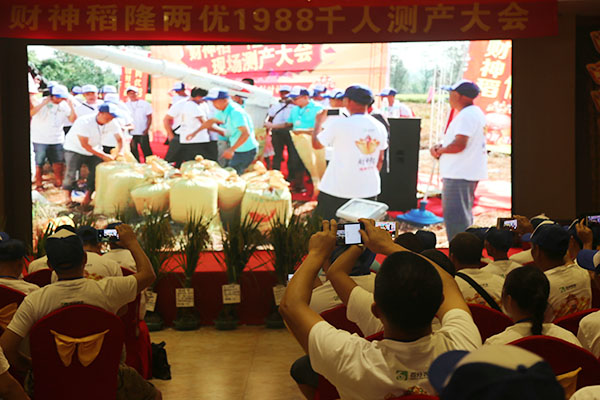當(dāng)天,重慶各個(gè)區(qū)縣的水稻經(jīng)銷商、種糧大戶和村民代表等六七百人,通過(guò)到現(xiàn)場(chǎng)觀摩或在酒店觀看電視直播方式,一起見(jiàn)證了隆兩優(yōu)1988水稻在新盛鎮(zhèn)新盛村種植的情況。經(jīng)過(guò)對(duì)唐洪平種植的1.3畝水稻進(jìn)行機(jī)收測(cè)產(chǎn),平均畝產(chǎn)量達(dá)1965.27斤,成為梁平最高水稻畝產(chǎn)量,高出村民種植的常規(guī)水稻700斤左右。