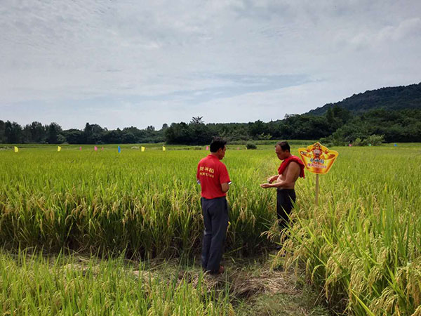 所有人員到齊后,正式到田間觀摩。在現(xiàn)場(chǎng)由零售店鄒老板做隆兩優(yōu)1988在當(dāng)?shù)氐脑耘嘟榻B和田間的水肥管理。今年遇高溫天氣影響很多品種出現(xiàn)了結(jié)實(shí)率低,大大減產(chǎn)的情況,而隆兩優(yōu)1988在當(dāng)?shù)氐慕Y(jié)實(shí)率達(dá)到了90%以上,空殼率低,得到了在場(chǎng)所有人的高度認(rèn)可。