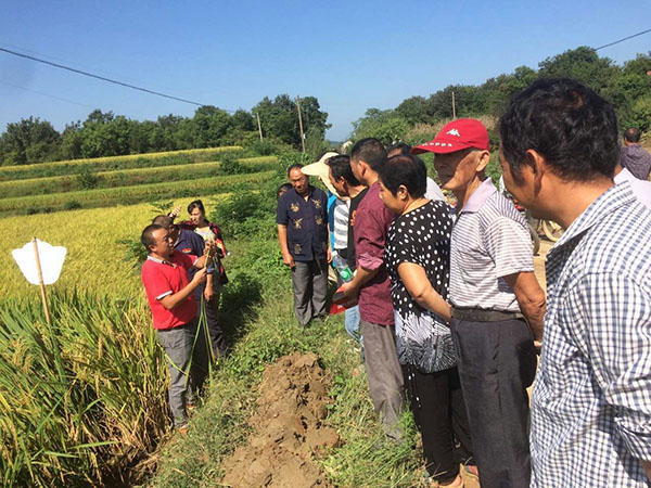 2017年9月7日,鐘祥財神稻隆兩優(yōu)1988的代理商盧總和百分農(nóng)業(yè)胡經(jīng)理來到美麗的東橋鎮(zhèn),帶著40多名東橋鎮(zhèn)的農(nóng)戶來到位于東橋的財神稻隆兩優(yōu)1988的示范田。大家到了田邊就被財神稻隆兩優(yōu)1988的表現(xiàn)所折服。雖然農(nóng)民看到的田塊還有5天就可以收割,但是葉片依然挺立,沒有一點早衰的跡象。對比周邊的其它“趴在地上”品種,形成了極大的反差。