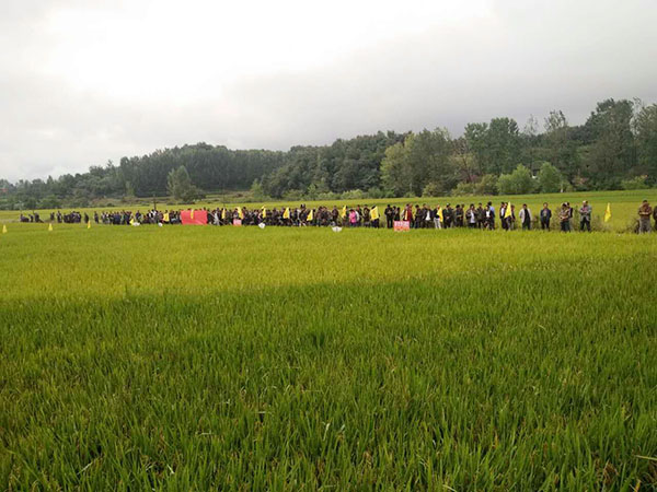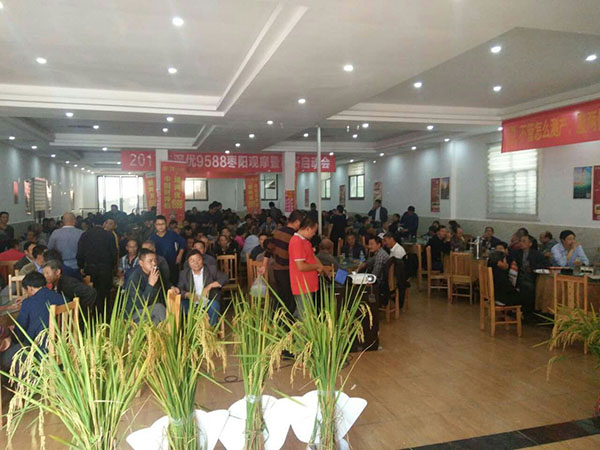 上午8點(diǎn),來自各個(gè)鄉(xiāng)鎮(zhèn)共計(jì)308名經(jīng)銷商和農(nóng)民朋友在棗陽市代理商吳總的組織下乘車前往,浩浩蕩蕩的車隊(duì)將參會(huì)的300多人載到棗陽市清潭鎮(zhèn)財(cái)神稻——隆兩優(yōu)1988的示范田。300多人有序地朝著周光寶師傅家的田塊走去。一到周師傅家的田里,300多人都對(duì)今年財(cái)神稻隆兩優(yōu)1988的結(jié)實(shí)率所折服,紛紛豎起了大拇指。還有很多人猜測(cè),至少有1800斤/畝。大家都到齊后,胡經(jīng)理給大家介紹了財(cái)神稻隆兩優(yōu)1988的品種特性,接下來周光寶師傅對(duì)自己的田塊如何種植做了簡(jiǎn)短地介紹,從他的言語中表露出對(duì)今年財(cái)神稻隆的表現(xiàn)非常滿意。