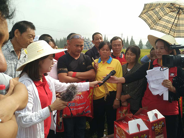 測產(chǎn)會逐漸接近尾聲,互動環(huán)節(jié)的結(jié)果也出來了,亞化事業(yè)部總經(jīng)理洪祥為獲獎農(nóng)戶頒發(fā)獎品,農(nóng)戶們拿著獎品臉上也是樂開了花:“這個(隆兩優(yōu)華占)種子好,產(chǎn)量高,你們活動也蠻好!以后一定多種你們這個(品種)!”