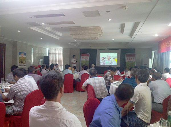 11點30分大家來到了位于肥東片區(qū)的強力大酒店進行室內會議,由亞華種業(yè)安徽分公司田洪燦經理簡單介紹了隆平高科的架構組成;2017年隆兩優(yōu)華占獲得的三大殊榮:四大區(qū)域國家審定、水稻年度明星品種、2017農業(yè)部超級稻;重點強調了隆兩優(yōu)華占的四大優(yōu)點:超抗倒、超抗病、超高產、超優(yōu)質。以及隆兩優(yōu)華占八大特征、特性,一:珠葉形態(tài)好、二:分蘗力強、三:耐肥、抗倒、四:高抗稻瘟病、五:抗高溫、耐低溫、六:適合各種栽培模式、七:秧齡彈性大、八:主穗、分蘗穗整齊,大小基本一致,群體優(yōu)勢突出,高產穩(wěn)產。隨后例舉了霍邱、定遠等地的2017年的測產情況照片,讓大戶加深對隆兩優(yōu)華占的了解。最后田洪燦經理拿出一份由國字號媒體《農民日報》刊登的《高溫“烤”出的好品種》一文,再次強調了隆兩優(yōu)華占抗高溫、米質優(yōu)、產量高的特征特性。此次匯報大約持續(xù)半個小時,農戶都在聚精會神地聽講,其對隆兩優(yōu)華占的稱贊不言而喻。