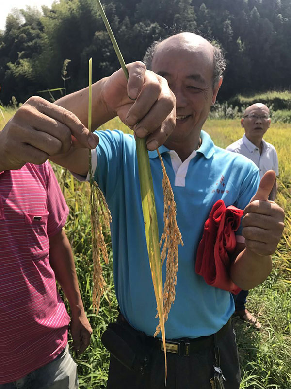 與會人員來到觀摩會現(xiàn)場沿著田埂、彎下身子看著將要收割的隆兩優(yōu)1988水稻,被眼前大大的稻穗、超高結實率的景象所深深地打動,比穗子的比穗子,數(shù)粒數(shù)的數(shù)粒數(shù),紛紛猜測著這塊田能收割多少斤,都想馬上知道財神稻到底能有多高的產(chǎn)量,興奮得像是自家的田地一般。示范戶陳有林說:“我這塊田肥水一般,靠近田埂里邊還會冒冷水,今年能種植長勢如此之好的水稻,靠的是“財神稻”這樣好品種,來年我50多畝耕地全部種上隆兩優(yōu)1988”,大家一致贊同,真是喜看稻田千重浪,欣然起舞在其間!