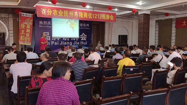 上午11點(diǎn)半,室內(nèi)會(huì)議準(zhǔn)時(shí)召開,首先由李寒晗經(jīng)理做了簡(jiǎn)短的公司介紹,讓大家對(duì)湖南百分農(nóng)業(yè)科技有限公司有更加深刻的了解。然后由袁應(yīng)亮經(jīng)理對(duì)隆王稻隆兩優(yōu)1212的品種來(lái)源、特征特性、產(chǎn)量表現(xiàn)、相對(duì)應(yīng)的栽培方式以及病蟲害防治都做了詳細(xì)地講解,讓經(jīng)銷商朋友對(duì)隆兩優(yōu)1212的大力推廣充滿信心。最后,我們請(qǐng)了南城縣糧油公司的尤總對(duì)隆兩優(yōu)1212的米質(zhì)給出了專業(yè)的意見,他承諾“隆兩優(yōu)1212的米質(zhì)確實(shí)好,我們會(huì)按照優(yōu)質(zhì)優(yōu)價(jià)的原則保證收購(gòu)。”